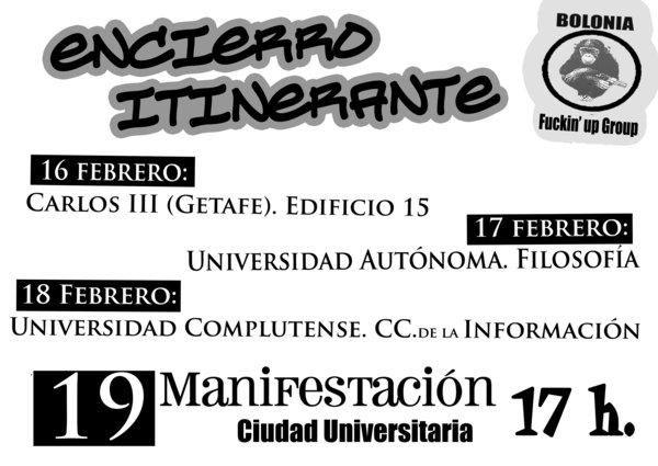 Los siguientes días habrá encierros en otras universidades de Madrid, donde se podrá tomar contacto con otras realidades universitarias, conocer gente y, tod@s junt@s, plantear una alternativa a lo que los rectores, los gobiernos y las empresas pretenden imponernos.
