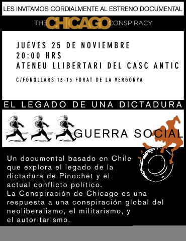 La Conspiración de Chicago es un documental que lleva tres años de realización. El trabajo fue grabado en Chile, y la historia se extiende a las tierras indígenas Mapuches del Wallmapu. El concepto de la película nació con la muerte de un ex dictador militar. Celebramos en las calles de Santiago con miles de personas después de haber escuchado la noticia: el General Augusto Pinochet había muerto. Su régimen asesinó miles y torturó decenas de miles después del golpe militar el 11 de septiembre de 1973. Celebramos su muerte y la implicancia que el sistema político y económico que le llevo al poder podría en sí mismo ser mortal. Empezamos este documental con la muerte de un dictador, pero continuamos con el legado de una dictadura.