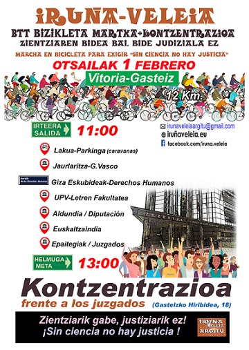 · La marcha y concentración: El 1 de febrero, sábado, para reivindicar la vía científica haremos una marcha a las 11:00 en bicicleta de 12km por Gasteiz para después reunirnos con los que no pueden ir en bici en frente de los juzgados a las 13:00. Os necesitamos ese día.