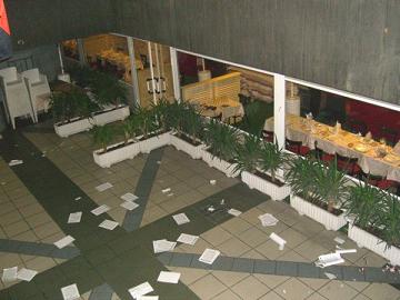 Desde la CNT, se hizo un llamamiento para llevar a cabo una acción numerosa. Previendo que nos juntásemos más de veinte personas se legalizó la concentración, motivo por el que la policía, estando sobre aviso, nos esperaba para impedir que accediésemos a los bajos (zona comercial y por tanto privada) en los que estaba situado el restaurante.