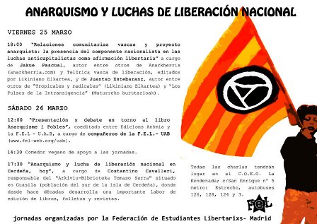 “Relaciones comunitarias vascas y proyecto anarquista: la presencia del componente nacionalista en las luchas anticapitalistas como afirmación libertaria” a cargo de Jakue Pascual, autor entre otros de Anarkherria (anarkherria.com) y Telúrica vasca de liberación, editados por Likiniano Elkartea y de Juantxo Estebaranz, autor entre otros de Tropicales y radicales (Likiniano Elkartea) y Los Pulsos de la Intransigencia (Muturreko burutazioak).