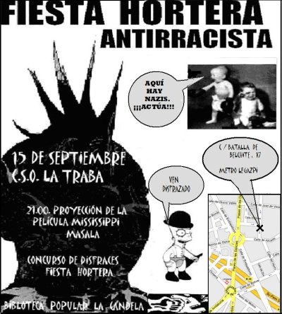 Esta sábado 15 de septiembre, vente para la FIESTA HORTERA ANTIRRACISTA que celebramos en el CSOA La Traba (C/Batalla de Belchite, 17, metro Legazpi).