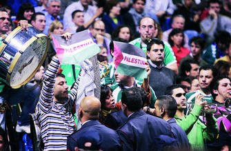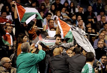 La profusión de 'kefias' en las gradas del pabellón mostró a las claras la solidaridad de parte de la población malagueña con el pueblo palestino, que desde hace unos días sufre los ataques de uno de los ejércitos más poderosos del mundo.