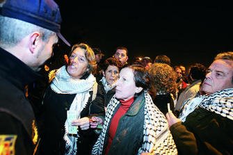 El momento de máxima tensión comenzó una hora antes en las inmediaciones del pabellón entre la policía y algunos de los integrantes de una manifestación no oficial en favor de Palestina y contra la intervención militar israelí en Gaza que se congregó en los aparcamientos del centro comercial Carrefour.Las 50 personas que integraban la protesta se desplazaron pacíficamente hasta el pabellón con la única identificación del pañuelo palestino -kefia- como medida de protesta. Sin embargo, a 30 metros de la entrada al recinto un cordón policial le impidió el paso. Fueron momentos tensos en los que hubo empujones y algunas palabras más altas que otras. Los agentes exigían para acceder la entrada para tomar nota del asiento; los manifestantes se negaban de cualquier manera alegando incluso que algunos tenían la intención de sacar su localidad en las taquillas.