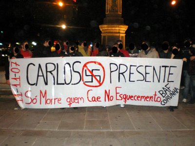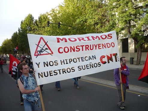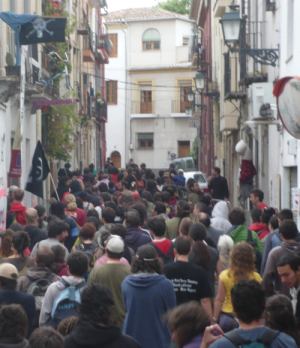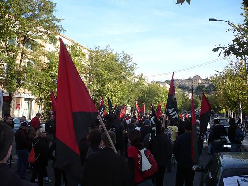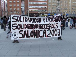 Durante la tarde del martes 6 de mayo de 2008 se ha llevado a cabo una iniciativa de apoyo con los comapañeros detenidos durante las protesas contra la cumbre de ministros de la UE, la cual tuvo lugar en la ciudad griega de Salónica en junio de 2003. El proceso judicial acaba de comenzar. Entre ellos figura un joven libertario burgalés sobre el que pesan graves cargos. Sus amigos y compañeros han realizado una concentración que, desembocando en manifestación, ha recorrido las calles de Gamonal -su barrio natal- para recordar que los procesados no están solos. Un reportero gráfico de DV (Diario de Vurgos) nos muestra las imágenes del evento.