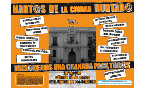 El equipo de gobierno municipal del Partido Popular, en ocasiones con colaboración de la oposición, ha desarrollado un modelo de ciudad cada día más polarizado, con un centro mimado y unos barrios abandonados; con un modelo de movilidad basado en el vehiculo privado y en el negocio de los parkings y las multas, con calles llenas de coches, con pocos buses y pocas vías aptas para peatones y ciclistas; con un cuidado exquisito de las clases con altos ingresos, sus actividades y sus preferencias, y el descuido de aquellas personas que atraviesan por problemas (se crea una escuela de golf en la Chana y se reduce los presupuestos para temas sociales); con una apuesta por la especulación y la destrucción de nuestro patrimonio (Vega, edificios históricos...); degradando y privatizando los espacios públicos y expulsando de la calle a artistas, persiguiendo la mendicidad y la prostitución; jugando con el despido de cientos de trabajadores por el impago de sus deudas adquiridas, estrangulando económicamente a asociaciones y entidades que ejecutan diversos proyectos responsabilidad del Ayuntamiento, y a las que tampoco paga; creando un cuerpo policiaco conocido por sus malos tratos y por su prepotencia; haciendo una política de adjudicaciones y concursos, cuanto menos, poco clara; favoreciendo el amiguismo y los “puestos de confianza” en la gestión municipal, etc.