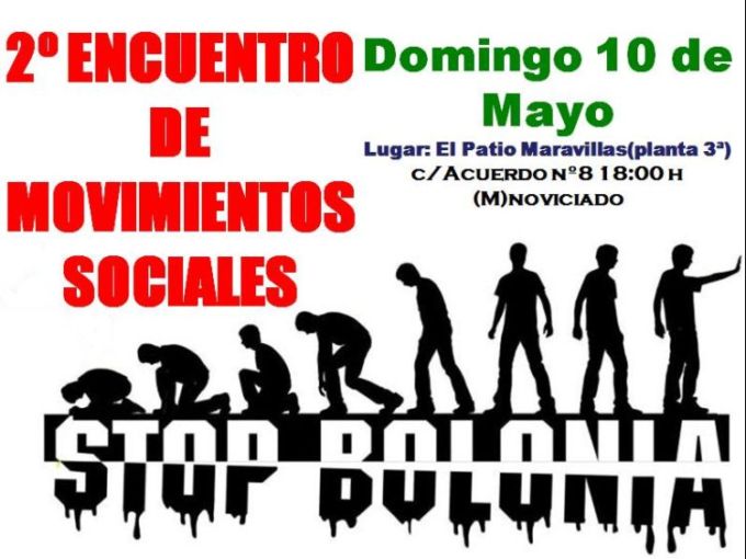 El 25 de Abril del mes pasado tuvo lugar el I Encuentro de Movimientos Sociales promovido por las Asambleas contra Bolonia de Madrid en el que movimientos sociales, colectivos y organizaciones nos reunimos para realizar una puesta en común de las diversas luchas que estamos llevando a cabo y vimos la necesidad de aunar fuerzas.