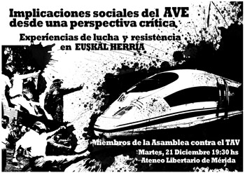En Extremadura el proyecto ya en marcha del AVE cuenta con un pretendido consenso social, pero algo parece estar eclosionando y se empiezan a escuchar voces disonantes. Para aprender de otras experiencias de lucha y compartir análisis hemos invitado a miembros de la Asamblea contra el TAV de Euskal Herría.