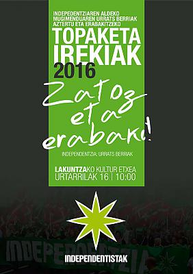 ENCUENTROS ABIERTOS para analizar y decidir los nuevos pasos a dar por el movimiento independentista (Lakuntza, 16 de enero).En la conferencia nacional que se celebró en marzo de 2014 la red Independentistak debatió y decidió su plan estratégico 2014-2015, y las líneas de actuación y el plan de trabajo que quedaron recogidos en la ponencia “Tiempo de dar pasos firmes hacia la independencia” han sido el eje de nuestra actividad a lo largo de estos dos años.