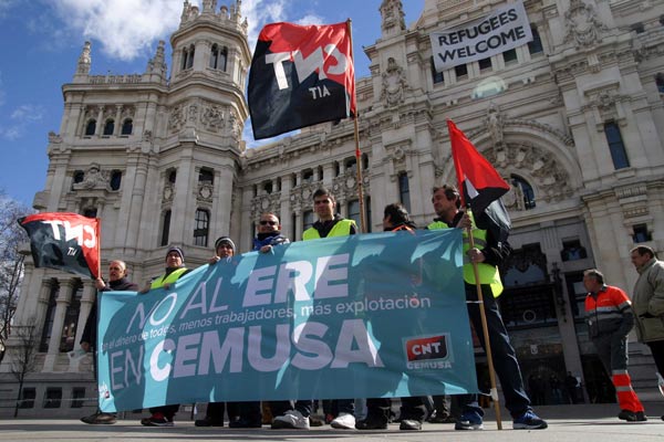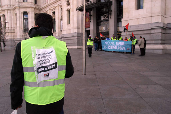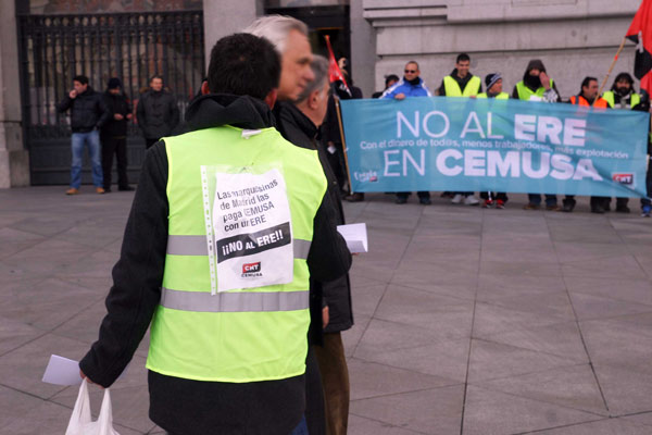 Hacia el medio día, la Sección Sindical de la CNT en CEMUSA ha defendido sus puestos de trabajo a las puertas del Ayuntamiento de Madrid.