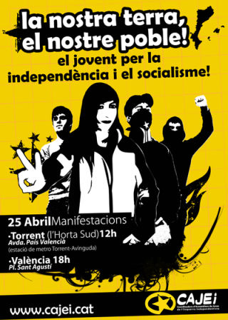El jovent independentista i socialista dels Països Catalans irrompem aquest 25 d’abril amb arguments de pes. La crisi del sistema capitalista és un fet. Aquest ha demostrat la seua incompetència per repartir riquesa i benestar a la majoria del planeta. Hui, però, sota l'excusa de la crisi, el jovent som més precaris que mai i el nombre d'acomiadaments ja és de més d'un milió arreu del Països Catalans. Al seu torn, la crisi nacional no troba eixida perquè els estats espanyol i francès continuen en la seua dinàmica de no cedir davant el reclam de llibertat dels pobles sotmesos. Tres-cents dos anys després de la desfeta d’Almansa, el País Valencià continua governat pels hereus del centralisme espanyol més retrògrada. Els Països Catalans s’han convertit en la sucursal de facto de l’Estat espanyol gràcies a l’inestimable suport prestat per la burgesia de tot el país, d’ordre espanyola i neoliberal.