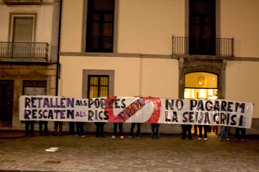 Pel matí ens despertàvem amb l’aparició de la notícia a un conegut periòdic provincial, de que “Nules” estava “en alerta por una protesta durante el pleno”. Mentre la gent del poble es trobava amb aquest suculent titular, els aplegaven notícies de que una parella de la Policia Nacional, cos que no te implantació a Nules, anava passejant-se pel cèntric Carrer Major, deixant la sensació entre els veïns de que alguna cosa, i no bona, anava a passar per la vesprada. Amb puntualitat aplegaven els participants a la Plaça Major, on hi havia una representació de la Plataforma d'Afectats per la Hipoteca (PAH) deixant vore les seues reivindicacions i recollint signatures per a la I.L.P. sobre la legalització de la dació en pagament i el lloguer social. De seguida es van desplegar dues pancartes amb els lemes: “Retallen als pobres. Rescaten als rics. Prou! No pagarem la seua crisi” i “#prouretallades. Hem perdut la por”. I va començar la protesta. Tot i que la majoria dels assistents no portaven res per a fer soroll, els que si que ho duien van fer que en alguns moments la protesta fos ben sonora. I entre el clima distés però compromès, es deixava caure per allí algun conegut membre de la dreta local, amb mirada xulesca i desafiant als manifestants, com esperant que algú li digués alguna cosa. Ni cas. També va eixir del ple a vore la protesta una persona molt pròxima al partit que governa. No sabem ben be amb quines intencions. I quan ja quedava menys gent que més, però la xiulada continuava, un ancestral estomac agraït de l’Ajuntament, amb cabell blanc, va passar per damunt d'una de les pancartes. En recriminar-li un dels manifestants la seua actitud va respondre “pues ponla allí, que no la he visto” amb un irònic somriure, el que ens fa pensar que ho va fer aposta, tal volta envalentit per una abusiva ingesta d'alcohol, però açò ja és parlar per parlar.