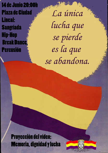 Ylucha…porque es el único camino para recuperar lo que es nuestro, paraabolir la explotación, para poner a cada uno en el lugar quecorresponde en la Historia y en la vida. Lucha para desenmascarar aaquellos que disfrazados de demócratas gozan en las altas esferas delos poderes públicos y en los consejos de administración de empresas ybancos. Lucha porque la experiencia nos ha enseñado que es la única víapara conquistar derechos, para arrancarle al capital lo que nos roba adiario de nuestro trabajo. Lucha porque la monarquía impuesta por elgolpe militar fascista y los largos años de dictadura mantiene intactoslos cimientos de un sistema que perpetúa la desigualdad, que beneficiaa los de arriba y erosiona sin saciedad los limitados derechos socialesy políticos conquistados mediante la lucha de quienes nos precedieron.Buena muestra de que este sistema amparado por la monarquía está alservicio de los capitalistas y no de la mayoría trabajadora, son lasmedidas que el gobierno de turno está aplicando para hacer frente a unacrisis que tratan de minimizar mediante un discurso que niega laevidencia. El ataque a los derechos laborales mediante lapreparación de una nueva contrarreforma laboral que ya negociangobierno, patronal y sindicatos mayoritarios; la ofensiva contra elsistema público de pensiones mediante la próxima revisión del pacto deToledo y el incentivo a los planes privados, el recorte de losservicios públicos como la sanidad o la educación que progresivamentese van poniendo en manos privadas donde prima el beneficio sobre lacalidad del servicio y el aumento de la represión contra las libertadespúblicas y los derechos políticos como respuesta a un más que probableaumento de las luchas son las medidas que aplica un gobiernosupuestamente progresista en un sistema supuestamente social y dederecho. Ante esta realidad, a los trabajadores, a los vecinos en losbarrios, no nos queda otra alternativa que organizarnos para luchar.Desde el Colectivo por la III república de Ciudad Lineal te invitamos asumarte a nosotros en la construcción de un sistema donde prime elinterés de la mayoría trabajadora sobre el de una minoría ociosarepresentada en las clases capitalistas y los estamentos anacrónicoscomo la monarquía y el clero, donde los servicios públicos de calidadsean un bien común de primer orden, y donde la democracia sea cierta yse extienda a todas las esferas de la vida pública incluida la economía.