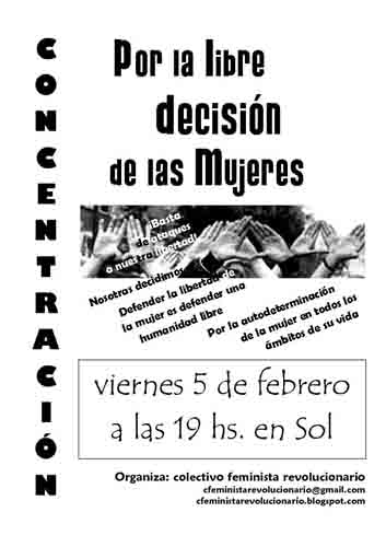 Ven el 5 de febrero en Madrid a las 19:00 en Sol a la concentración que convocamos, dentro de la campaña en la que hemos hecho charlas y hemos buscado hablar con vosotras para defender juntas nuestra libertad de decisión. ¡Basta ya de ataques a nuestra capacidad de decidir sobre nuestra vida!