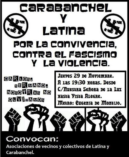 El pasado 11 de noviembre, el joven de 16 años, Carlos Javier Palomino, vecino de Vallecas, fue asesinado a manos de un neonazi, por el único motivo de acudir a una concentración de rechazo del racismo y de la xenofobia. Por la misma razón, Alejandro, vecino de Carabanchel y Aluche, fue herido de gravedad por la misma persona de ideología nazi.