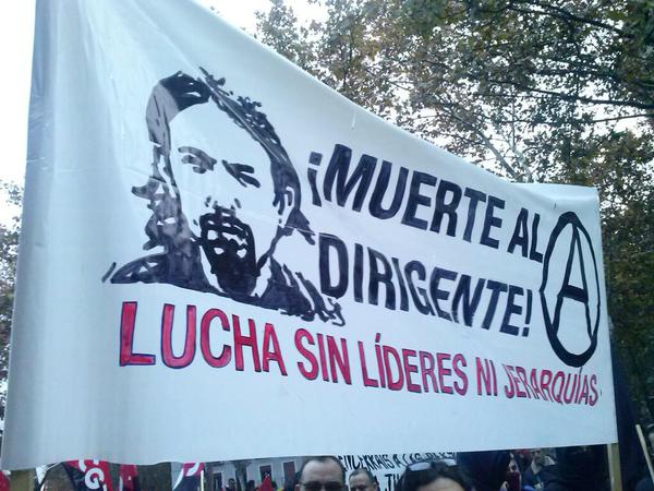 El 29 de Noviembre de 2014 tuvieron lugar en Madrid Las Marchas de la Dignidad, en las que aparecía una pancarta con el lema “Muerte al Dirigente” y en la que aparecía la cara de Pablo Iglesias, secretario general de Podemos. Dicha pancarta, que no pasó desapercibida, recibió fuertes críticas desde ciertos sectores del entorno anarquista. Los ataques que la pancarta recibió (pocos buscaban el debate, muchos la crítica fácil y bravucona) por parte de algunos anarquistas nos provocaron gran sorpresa, puesto que el anarquismo en todas sus vertientes quiere lograr la destrucción de cualquier tipo de autoridad, siendo una de las más fáciles de reconocer el poder político (no una de las más graves, puesto que cualquier forma de autoridad destruye la libertad de raíz y mata la igualdad, al crear dos clases diferenciadas y de intereses antagónicos: la clase que ejerce esa forma de autoridad y la que la sufre). El lema de esa pancarta alude a la esencia misma del anarquismo, a su razón de ser, a la desaparición de cualquier tipo de líder que decida sobre nuestras vidas. Hay gente que argumentaba que el lema es demasiado radical, que así asustamos a la gente, que estamos pidiendo la muerte de una persona.