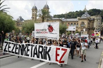 Los manifestantes, que encabezaban la marcha con una pancarta con el lema "Zezenketarik ez!", ha partido a las seis de la tarde del Boulevard donostiarra, donde la asociación convocante, Askekintza Liberacción Animalista, ha instalado un puesto de venta de camisetas con motivos antitaurinos.