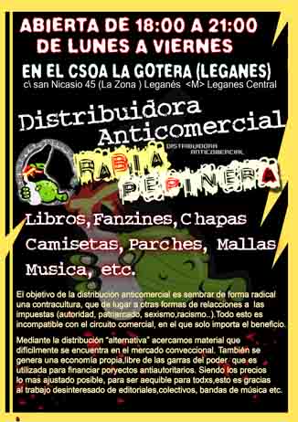 Mediante la distribución “alternativa” acercamos material que difícilmente se encuentra en el mercado conveccional. También se genera una economía propia, libre de las garras del poder, que es utilizada para financiar proyectos antiautoritarios. Siendo los precios lo más ajustados posible, para ser asequible para todxs, esto es gracias al trabajo desinteresado de editoriales, colectivos, bandas de música, etc.
