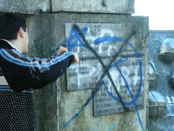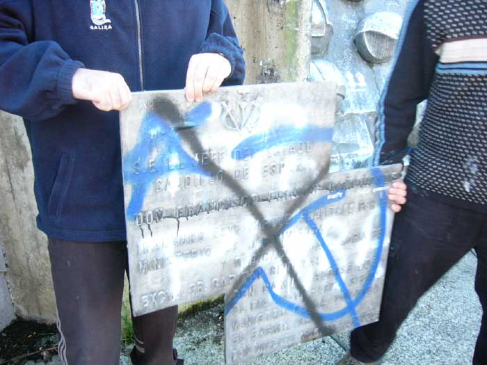 Desta vez, por meio da accom directa, era retirada no bairro operário de Caranca umha placa de ferro localizada no monumento ao chefe militar fascista Camilo Alonso Veja, em que se fai alusom à inauguracom do Polígono de Caranca a 19 de Agosto 1972, em que participárom o ditator Francisco Franco junto a umha boa parte de membros do Governo franquista.