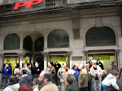 Em destaque na foto, a "barreira humana de seguranca" com que a UPG exerceu labores para-policiais protegendo a sede do PP em Lugo