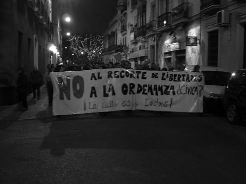 La marcha salió sobre las 18:30 del Centro Cívico las Sirenas, en la Alameda de Hércules. Una gran pancarta encabezaba la manifestación: "No al recorte de libertades, no a la ordenanza ¿cívica? ¡La calle es de todxs!", mientras que otras expresiones se integraban en la marcha. De nuevo, como ya viene siendo habitual en las movilizaciones populares de la ciudad hispalense, una fuerte presencia policial vigilaba los movimientos de la manifestación sin que hubiera mayores problemas.