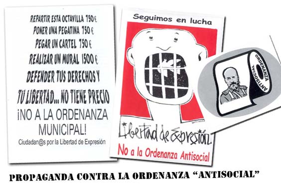 "Los comportamientos antisociales a que se refiere la ordenanza (...) son variados y de muy diferentes características: realizar pintadas, quemar contenedores, pegar pegatinas, repartir octavillas, romper árboles, pegar carteles, colocar pancartas en las ventanas de nuestras casas, realizar concentraciones sin permiso, ensuciar tras una concentración con permiso o sin él, dejar cagar al perro en la calle, vaciar las colillas del coche en un semáforo, arrojar papeles a una fuente, escupir , etc.. Como se puede ver , se mezclan como que no quiere la cosa dos clases de comportamientos : por un lado, la difusión del pensamiento crítico y revolucionario (pegatinas, pintadas, octavillas, carteles, pancartas, concentraciones y actos públicos), por otro lado, actitudes, como mucho, un tanto guarras (tirar papeles, escupir, vaciar el cenicero, etc.) " (texto extraído del boletín MATA EL MIEDO abril-2004)