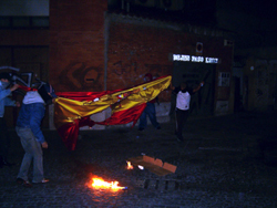Este mismo día por la noche, un grupo de antifascistas, quemó una bandera constitucional en la Pza. de Cantarranas, como símbolo de protesta hacia el Estado fascista Español y todo lo que este representa, ante la mirada atónita y aplausos del resto de gente que por allí pasaba.