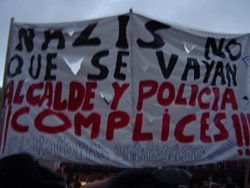 Por último quedaría mencionar la concentración organizada por la Plataforma Antifascista de Valladolid (PAV), frente a los Juzgados de la C/Angustias, donde alrededor de medio centenar de compañeros antifascistas se reunieron, para denunciar la impunidad de las bandas fascistas en nuestra ciudad, ya que se celebraba un juicio a 3 neonazis que habían amenazado de muerte a un militante de la izquierda vallisoletana, con unas pintadas en el portal de su casa. Los policías se dedicaron a chulear y a amenazar a los manifestantes, con mensajes como: " Dímelo a la cara ahora que estás solo", " En la próxima manifestación que te veamos, hables o no, te vamos a detener", "Os tienen bien enseñados" y demás lindezas que demuestran el talante fascista y amenazante propio de la policía española.