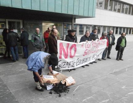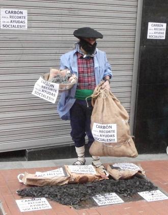 Olentzero ha llegado a Barakaldo para entregar varios sacos de carbón ante el Departamento de Acción Social y el consistorio fabril para denunciar los recortes aplicados en las ayudas sociales destinadas a las familias que tienen dificultades para llegar a fin de mes.