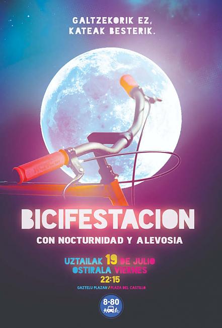 La organizacion estatal Con Bici organiza una marcha de bicis cada año en verano. La edicion de este año pasa por Navarra. La etapa del próximo sábado 20 saldrá de la plaza del Castillo de Iruñea a las 10 de la mañana bajo el lema de No al despilfarro de alta velocidad. Despues de pasar por varias calles de la capital llegara a la estacion de tren de San Jorge para alli partir hacia Estella. La vispera, viernes 19, a las 10:15 de la noche partirá tanbien de la Plaza del Castillo una marcha nocturna bajo el lema de Con nocturnidad y alevosia.