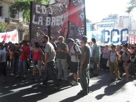 Una multitud convocada por el Encuentro Memoria, Verdad y Justicia, marcho el miércoles desde la Av. de Mayo y 9 de Julio hasta la Plaza de Mayo, para exigir el cese al feroz avance de la represión estatal, la criminalización de la protesta, la persecución, las torturas, el asesinato a los luchadores populares. Conjuntamente demandaron la libertad a los presos políticos de Bariloche y Corral de Bustos. Juicio y castigo a los autores y ejecutores de la persecución y el asesinato del pueblo Qom y demás pueblos de originarios y campesinos. Tras la marcha se entregó en Casa de Gobierno un petitorio de audiencia firmado por más de 350 organizaciones de todo el país.