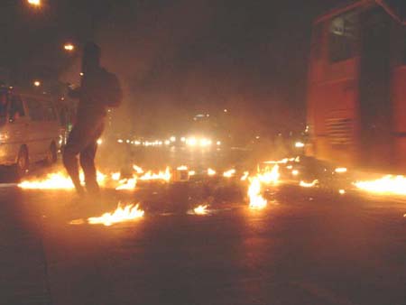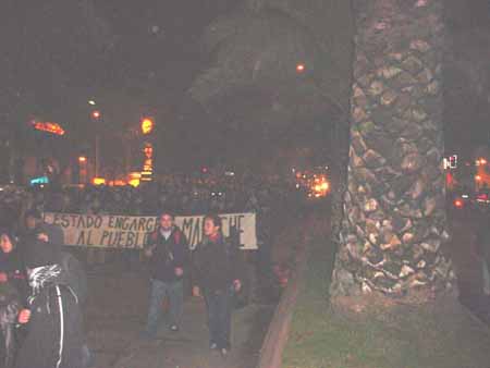 Luego la manifestación se traslado al frontis de la Usach, donde un@s 40 encapuchad@s salieron a cortar el tránsito, iluminando la noche y enfrentándose con carabineros por más de una hora. También se corto el fluido vehicular en Ecuador, donde las barricadas nuevamente fueron la respuesta a la prisión política del Estado (en medio de estos enfrentamientos un joven fue detenido).