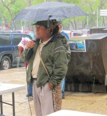 Al caer una fuerte lluvia, llegaron los compañeros desde San Pedro Tlanixco con un mensaje solidario del Movimiento por la Libertad de los Defensores del Agua y de la Vida. El compañero Rosario dijo: “Gracias por tomarnos en cuenta para esta actividad que se está realizando a pesar de las inclemencias del tiempo. Primero que nada queremos decirles que reciban un cordial y combativo saludo de parte de el movimiento por la libertad de los presos de la comunidad de San Pedro Tlanixco. Se esperaría que quien tuviera contacto o un acercamiento con Mumia, que le llevaran un saludo, ya que no lo conocemos pero compartimos también su lucha”.