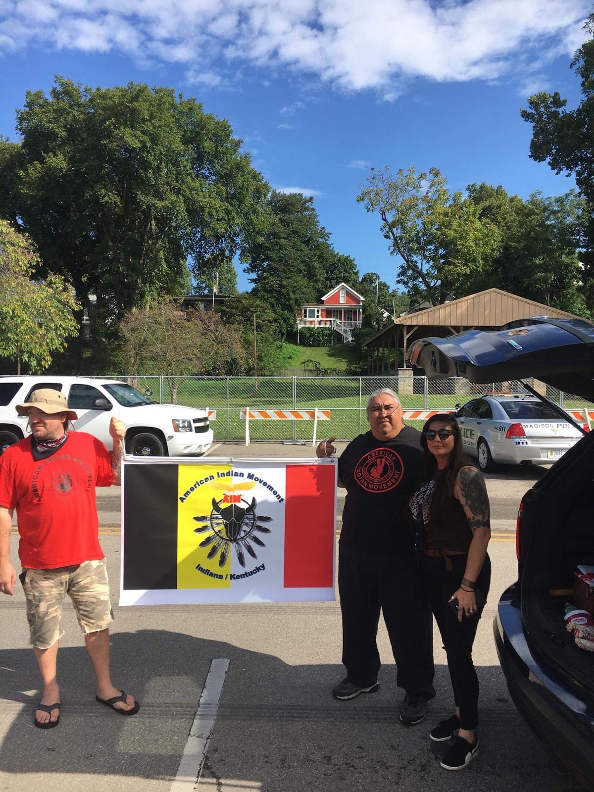 Sal Serbin: Por supuesto, cuando esta tierra fue "descubierta", inmediatamente capturaron a los indios americanos y los hicieron esclavos.miembros del AIM con una cartulina donde se lee "La única solución, la Revolución"