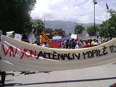 [*] Batay Ouvriye, Trabajadores de los Servicios Públicos (CTSP), Antenn Ouvriyè, Tèt Kole ti Peyizan Ayisyen, Mouvman Demokratik Popilè (MODEP), Solidarite Fanm Ayisyen (SOFA), Solidarite ant Jèn (SAJ/ Veye yo), Chandèl, Rasanbleman d'Organisations pour une nouvelle Alternative (RONA), Réseau d'Organisations de la Zone Ouest (ROZO), al igual que varias otras de barrio y de pequeñas vendedoras...