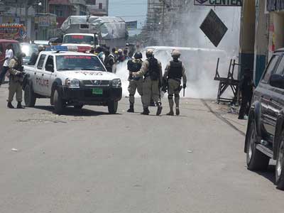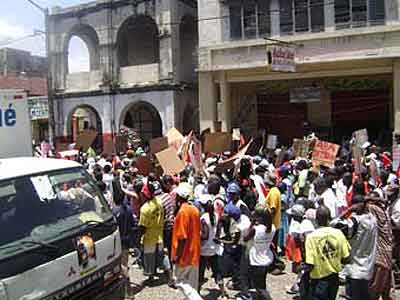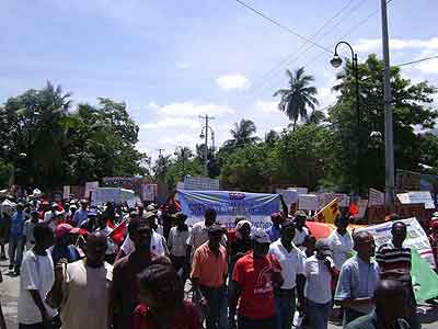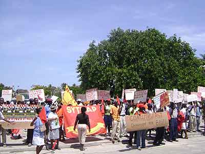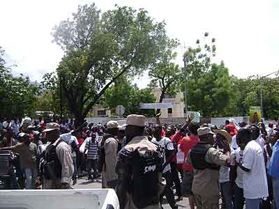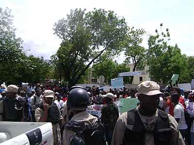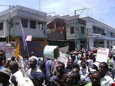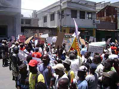 De hecho, reunidos frente al Palacio Legislativo desde las nueve horas de la mañana, el Colectivo[*] acompañado de la distintas delegaciones extranjeras de solidaridad: Coordinación Nacional de Lutas (Conlutas) y el Movimiento de Campesinos Sin Tierra (MST), los dos de Brasil; el Lyannay Kont Pwofitasyon (LKP) de Guadalupe; y el Public Service International (PSI) de Trinidad y Tobago[**] se desplegó rápidamente. Del Palacio Legislativo al Ministerio de Asuntos extranjeros (para antes que nada denunciar la ocupación); luego las oficinas del correo, la alcaldía, la telefónica (para protestar contra el no pago desde hace meses a los trabajadores, las revocaciones arbitrarias y la privatización amenazante de los servicios públicos); pasando por la Corte Suprema Fiscal (para denunciar la corrupción rampante en este país tan desnudado); luego por el Ministerio de Asuntos Sociales y del Trabajo (para exigir un salario conforme ajustado a la inflación y denunciar el papel reaccionario jugado por esta institución en este asunto); para, finalmente, pasando por el barrio popular de Bel-Air, acabar en la plaza del Cimarrón Desconocido en el Campo de Marzo, punto culminante de la marcha, rodeado de policía.