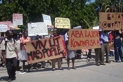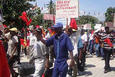 La represión del derecho más legítimo de los trabajadores a manifestarse fue violentamente ejecutada por las fuerzas especiales CIMO de la policía, negando el elemento esencial de nuestras conquistas post duvalieristas al igual que del movimiento obrero internacional del siglo XX, el derecho a la libre expresión. Es la manifestación la más repugnante pero concreta del abandono total del mandato dejado por el pueblo haitiano a este gobierno, de su traición, de su vil sometimiento a los intereses capitalistas internacionales.