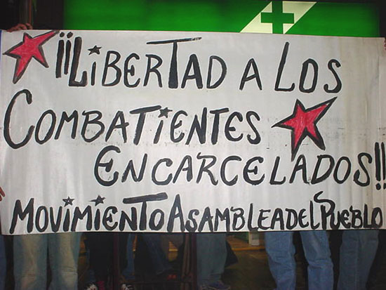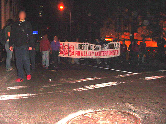 Luego se inicio la marcha, la cual apenas piso la alameda en su calzada norte, fue reprimida por carros lanza aguas de carabineros y a pie, tomando alrededor de unos 5 detenidos, y lógicamente mojando a quien se cruzara por el camino. La reagrupación se realizo en el paseo ahumada, avanzando y gritando consignas, para en el frontis del Banco del estado de dicha calle, leer una serie de discursos, exigiendo el indulto para no solo los luchadores chilenos tras las rejas, sino en todo el mundo.