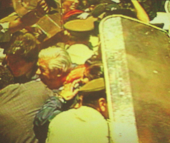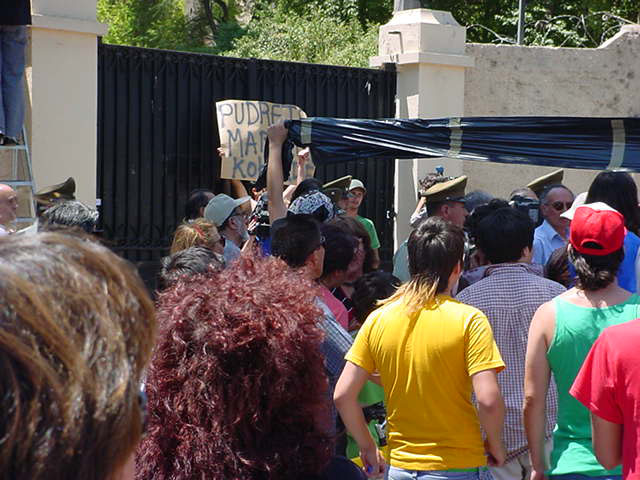 1:37 El mamo ya esta adentro, el auto corrio apenas pudo, al igual que el ex general en retiro y sus guardias, que quedaron cubiertos de huevos.