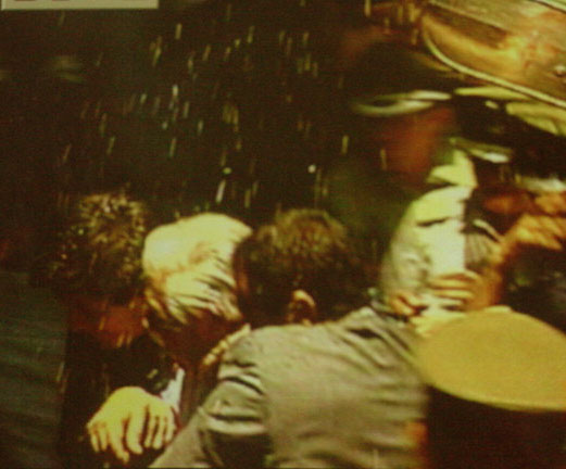 1:35: El mamo llega a los tribunales de justicia. Cientos de huevos, botellas caen sobre el auto, tienen que trasladar corriendo al mamo adentro de los tribunales. Apenas pudo salir del auto, mientras el clima es efervescente.