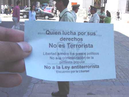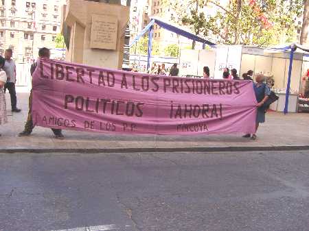 Al mediodía de este caluroso día Viernes (17 de diciembre), un grupo de aproximadamente 15 personas realizaron un “mitting” frente al Ministerio de Justicia (ubicado a un costado de la Plaza de la Constitución y a metros de la casa de gobierno), exigiendo la liberación de tod@s l@s pres@s polític@s. El grupo compuesto por familiares, amig@s y ex – prisioner@s polític@s de la Cárcel de Alta Seguridad (C.A.S.), además manifestó su apoyo incondicional a la huelga de hambre que se encuentra realizando desde el 10 de diciembre, Alvaro González Olivares, a quien Gendarmería le ha negado su derecho a postular a los “beneficios intrapenitenciarios” y a la libertad condicional.