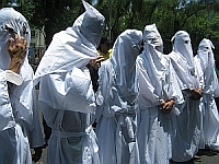 El tema del rechazo al racismo fue dramatizado por unos seis jóvenes vestidos en sábanas blancas, quienes mantuvieron una presencia silenciosa del Ku Klux Klan durante todo el mitin.