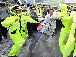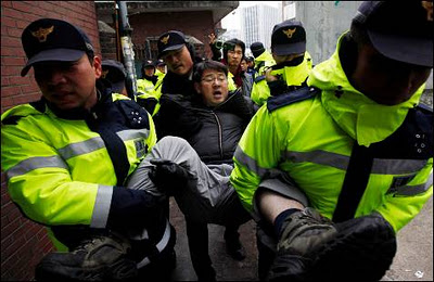 Entre estas imágenes podemos ver una con la siguiente descripción: “Varios policías detienen a un manifestante contrario a las ideas del régimen de Kim Jong il. REUTERS” La imagen muestra claramente cómo un joven es llevado en volandas por un grupo de agentes de policía. Reproducimos una captura de pantalla con las imágenes del Diario Público y con la imagen en cuestión: