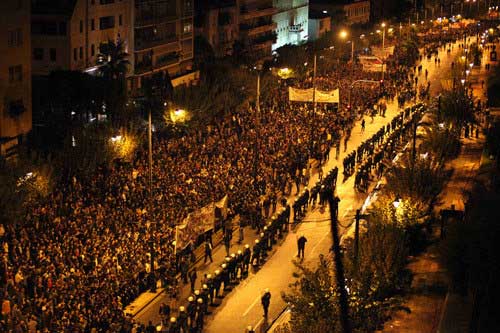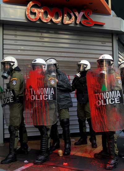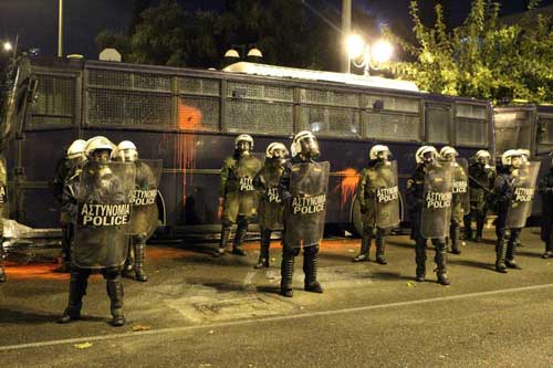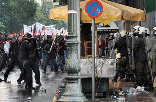 En Atenas se reunieron mas de 40.000 manifestantes recorriendo el centro de la ciudad,ante ellos un despliegue policial de 7.000 efectivos que convertían la ciudad en un verdadero estado de sitio.Un bloque anarquista de mas de 5.000 personas fue prácticamente cercado y provocado durante todo el recorrido,desde un principio los choques fueron constantes y el empleo de gases por parte de la policía no amedrento fácilmente a los manifestantes que respondieron de todas las formas posibles.