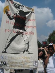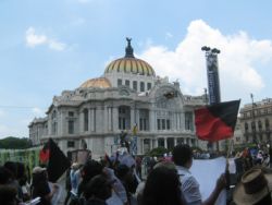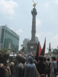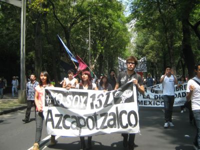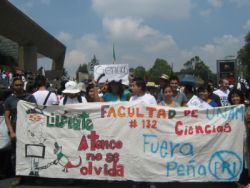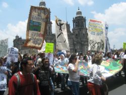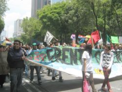 Sin lugar a duda, la energía más vital y efervescente de la marcha en el DF se sentía en los contingentes estudiantiles. Al responder a la pregunta sobre sus motivos para participar en la marcha, algunos estudiantes dijeron que su meta principal es impedir que Peña Nieto ascienda a la presidencia. “Pero hace falta mucho más gente en las calles,” dijo una compañera de la UNAM. “Somos miles pero hacen falta millones”. Un compañero del Oriente de la ciudad opina que “Peña Nieto es el personaje que nadie aguanta pero en realidad estamos en contra de todo el sistema de poder y dinero que él representa y esto incluye los medios. Ahora un periódico en Inglaterra, se llama el Guardian, sacó pruebas de cómo le pagaron millones a Televisa para promoverlo como candidato. ¿Por qué ningún periódico en México hace este tipo de investigación? Claro, sería un gran riesgo. Aquí matan a muchos periodistas”. Una compañera del IPN dice: “No sé si podemos evitar que sea Presidente, pero por lo menos lo estamos debilitando. También tenemos que pensar en qué va a pasar después de la toma de poder, sea quien sea el próximo presidente. Para mí es importante que nos estamos organizando mejor para hacer cambios”.