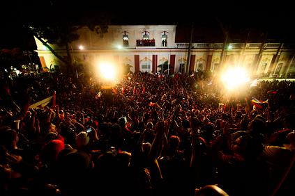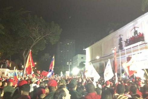 Cerca de las 11:20 minutos de la noche el Presidente reelecto salió al Balcón del Pueblo, en Miraflores.
