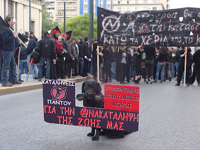 El martes 28 de abril a las 18:00 tuvo lugar en el centro de Atenas una multitudinaria manifestación convocada por grupos autónomos, antiautoritarios, anarquistas y centros sociales ocupados. Entre dos y tres mil personas recorrieron el centro y mas de la ciudad, protestando contra el paquete de restricciones sociales que el gobierno quiere implantar. Este, pasa por perseguir las ocupaciones, levantar el asilo universitario, criminalizar a los encapuchados, poner al servicio del aparato policial y judicial una red ampliadas de cámaras en la ciudad, legalizar la escucha de los teléfonos y perseguir la comunicación vía web. La policía guardo distancia frente al bloque que iba protegido por todos los frentes por personas con palos. No cargo en ningún momento, aun cuando se reventaron cámaras, cajeros y algún que otro coche por accidente.