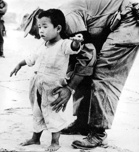 Soldado de EEUU cacheando a un niño norcoreano durante la guerra.