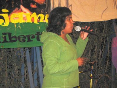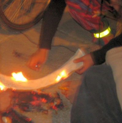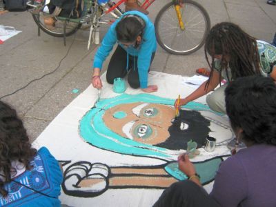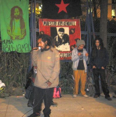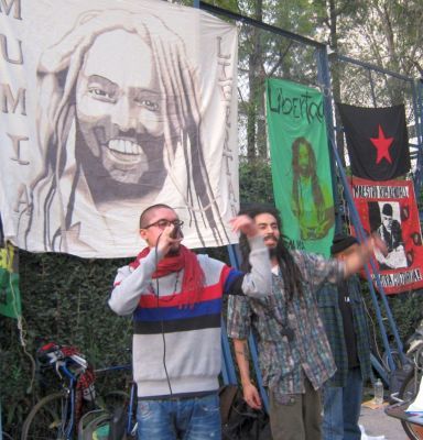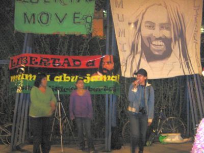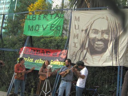 En la ciudad de México hicimos un acto afuera de la embajada de Estados Unidos donde quemamos mordazas, pintamos una manta, leímos textos de Mumia, y cantamos música jaranera y de rap, todo amplificado con un buen bici-sonido.