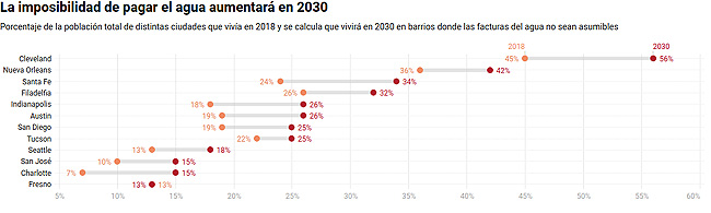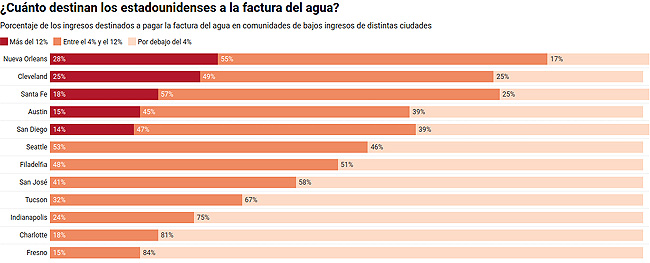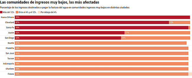 Los aumentos de precios tienen un impacto desproporcionadamente más elevado en la población pobre. En Nueva Orleans, Santa Fe y Cleveland, aproximadamente el 75% de los vecinos de bajos ingresos vive en barrios donde las facturas del agua y el servicio de saneamiento son inasequibles.